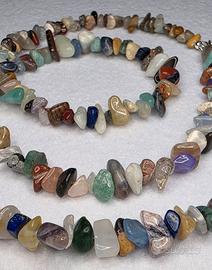 Elegante e vivace parure realizzata interamente a mano, perfetta per chi ama l’energia delle pietre naturali e lo stile boho-chic. Ogni pezzo è unico grazie alla varietà di colori e forme delle pietre "chip" (a scheggia), levigate per risultare confortevoli sulla pelle.