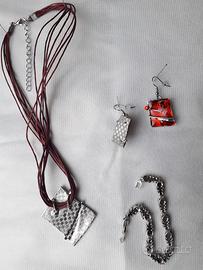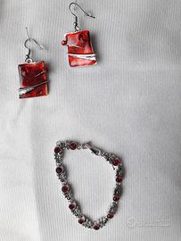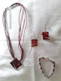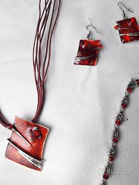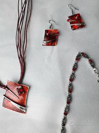 Elegante e particolare set bigiotteria composto da: collana a 7 fili e pendente smaltato rosso; orecchini che lo riprendono e braccialetto abbinato. Mai usato. Se interessati ad altri colori ed altri oggetti per unico pacco e sconto, cliccate sul mio profilo