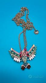 Parure bijoux vintage composta da collana a rete/multi-filo color oro con elemento a fiocco impreziosito da strass multicolore + spilla tonda importante con strass rossi, bianchi e baguette blu.