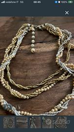 Parure vintage con collana e bracciale multifili intrecciati con perle e metallo dorato probabilmente marca Ottaviani