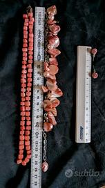 Parure composta da collana e bracciale in materiale sintetico color corallo, con riflessi madreperlacei che la rendono luminosa.