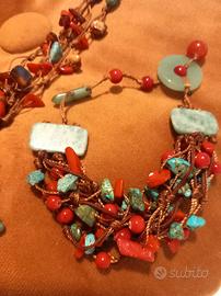 parure collana e bracciale di coralli e turchesi e ambra. Circonferenza collana 45cm; circonferenza bracciale 18 cm.
