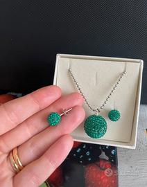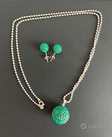 Collana e orecchini a lobo in argento 925 con sfera di strass verde smeraldo. Lunghezza catenina cm 5/ circa. Indossati pochissimo, come nuovi.