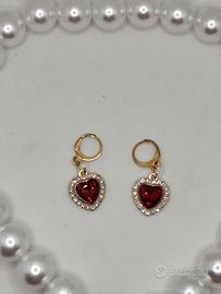 In coordinato, orecchini a cerchietto per lobi forati con pendente a cuore, rifiniti con gli stessi strass luminosi.