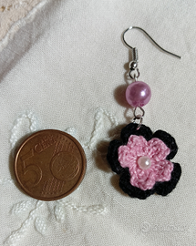 Gli orecchini, realizzati all' uncinetto, sono stati realizzati con colori che si abbinano alla collana ed ho applicato una perlina rosa che richiama quelli presenti nella collana.
