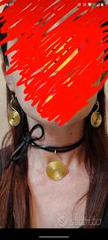 Set composto da collana choker con cordino in pelle nero e ciondolo + coppia di orecchini in filo di alluminio color oro spesso 2mm... La collana la puoi indossare in più modi (vedi foto)... Eleganti fini leggeri e delicati.
