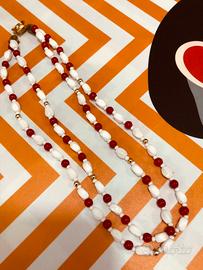 Difficile da trovare Parure completa di Collana+Orecchini, Originale anni 50/60 in perle e perline di vetro bianche e rosse con inserti di perline dorate