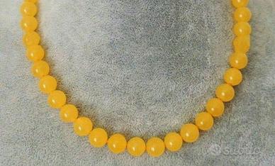 Stupenda collana con perle lisce e lucide da 10 mm di autentico topazio giallo naturale proveniente dal Brasile e orecchini parure a lobo. La parure è accompagnata da CERTIFICATO di GARANZIA del negozio ed è NUOVA.