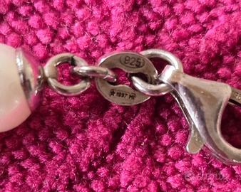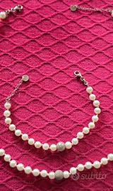 Bellissima parure di collana e braccialetto di perle coltivate con perla centrale in argento su entrambi i pezzi. Chiusura regolabile in argento. Lunghezza collana cm.46 max, braccialetto cm.18 max. Venduta nella scatola originale. Indossata per una sola occasione e conservata nella scatola.