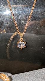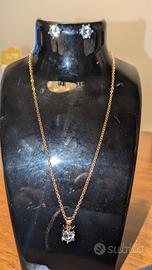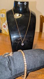 Elegante parure di gioielli in acciaio placcato oro e scintillanti zirconi,composta da collana punto luce, anello solitario regolabile, braccialetto tennis ed orecchini. Anallergico.Compreso cofanetto regalo. Alta bigiotteria