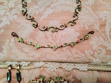 Parure donna Sodini collana orecchini girocollo bracciale spilla. Swarovski e pietre. Colore brillante, oro, verde e bronzo.