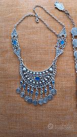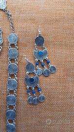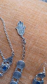 Un set molto versatile, perfetto per un look estivo, festival o stile bohémien. Parure completa composta da collana girocollo, bracciale e orecchini pendenti. Il metallo ha una finitura argento antico (brunito) con lavorazioni a sbalzo (motivi a spirale) e pietre sintetiche blu/azzurre. Stile: Etnico, Tribal, Boho-Chic. Dettagli Tecnici: Collana: Design a pettorina con piccoli pendenti circolari che creano movimento. Bracciale: Composto da maglie circolari con spirali incise e ciondolo finale a forma di Mano di Fatima (Hamsa), simbolo di protezione. Orecchini: Pendenti coordinati a forma di mezzaluna con perline blu.