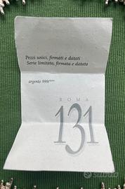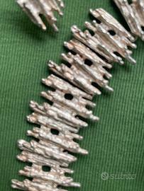 Parure composta da 1 collier e 2 orecchini. Lunghezza circa 40 cm. Peso complessivo 163 gr Argento 999. Punzone applicato su chiusura. Non ha parti danneggiate né usurate, ma semplici ossidazioni, tipiche dell'argento. Venne acquistata presso la Bottega di oreficeria di Via del Clementino 98/100, Roma, nel 2009. I gioielli sono dell'artista romano Fausto Maria Franchi, vincitore di molti premi. Il riconoscimento della critica avvenne nel 1964, con il 1° Premio per il Concorso Nazionale d’Oreficeria, indetto dal Ministero dell’Industria e Commercio, poi con la prima personale a New York, “Creazioni d’argenti bianchi” e nel 1965 con la committenza della legatura del “Libro d’oro della Città di Roma”. Nel maggio 2003 riceve dal Sindaco Walter Veltroni l’onorificenza di Maestro dell’Artigianato. Socio dell’Università e Nobil Collegio degli Orefici di Roma, del Schmuckmuseum di Phorzheim, del Deutsches Goldschmiedehaus di Hanau e dell’AGC, Associazione Gioiello Contemporaneo. Ideatore e direttore artistico di Gioielloinarte, concorso internazionale, indetto dall’Università degli Orafi di Roma, edizioni 2013 e 2016. Le sue opere fanno parte della collezione museale del Museo degli argenti di palazzo Pitti, Firenze, dello Schmuckmuseum di Phorzheim, del Neue Sammlung – Staatliches Museum München, Modern Museum di Monaco, del Museo d’Arte Medioevale e Moderna di Padova, oltre ad essere presenti in numerose collezioni private. Franchi è stato fra i sessanta artisti invitati, nel 2011, dal Pontificio Consiglio della Cultura del Vaticano, a partecipare all’Omaggio degli Artisti a Benedetto XVI, per il 60° Anniversario di ordinazione sacerdotale.