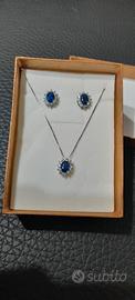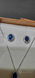 La parure è composta da collana con punto luce arricchito da zirconi bianchi e zaffiro centrale. Orecchini per foro a punto luce sempre in argento 925 con contorno di zirconi bianchi e zaffiro centrale.