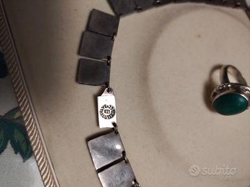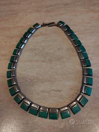 Vendo Splendida collana in malachite messicana completa di orecchini, montata in argento sterling 925. Tipica lavorazione artigianale di Taxco (Messico) con argento di alta qualità e stile vintage anni 60/70. Orecchini triangolari della stessa pietra, e anello ovale sempre in malachite. Per l'anello 10 g argento + la pietra. Sui siti USA potete trovare la valutazione.