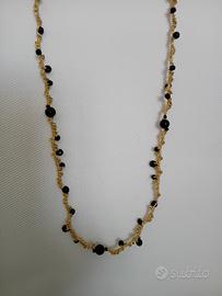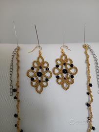 Orecchini (lunghezza circa 6 cm, monachella a scelta) e collana (lunghezza circa 78 cm, regolabile) fatti a mano in pizzo chiacchierino. Filato DMC Grandè color oro e perline nere. Vendo anche separati Altri gioielli in chiacchierino fatti da me nei miei annunci #chiacchierino #handmade