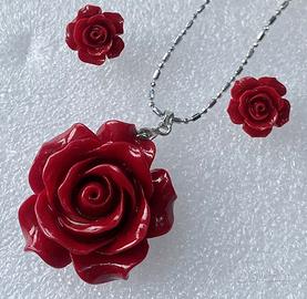 Meravigliosa parure collana con ciondolo rosa di autentico corallo intagliato a mano e orecchini a lobo da 14 mm.