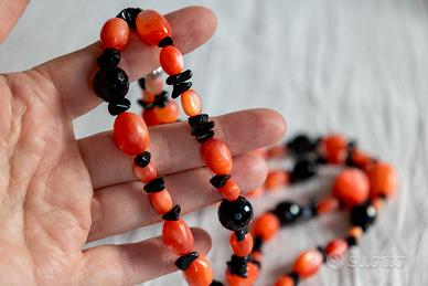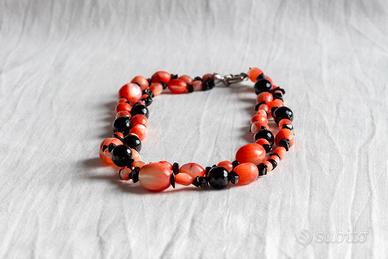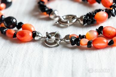 Collana più bracciale, pietre naturali nere e rosse con riflessi madreperlati, doppio filo sia su collana che su bracciale, entrambi con chiusura con estetica a gioiello. Pezzi unici realizzati da un gioielliere.