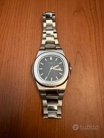 Cassa e bracciale in acciaio inox, quadrante scuro con indici luminosi e datario.