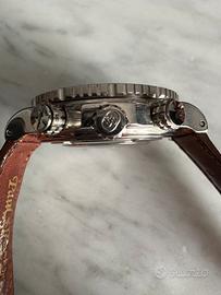 Cronografo subacqueo professionale originariamente testato a 100 m di profondità, con cassa impermeabile in acciaio, lunetta girevole unidirezionale graduata con tempi di decompressione.