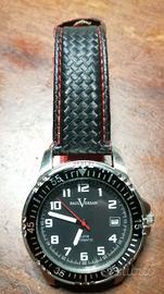 Quadrante nero con logo del marchio bianco - indicatori del tempo in numeri arabi bianchi, lancette di colore bianco - secondi in grande ago di colore rosso - Data alle 15 ore. Cinturino silicone e pelle usato ma in buono stato.