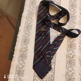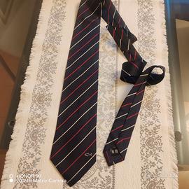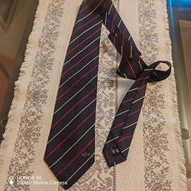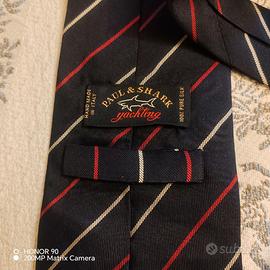 Cravatta in seta Paul & Shark a righe sottili rosse e bianche su fondo blu scuro . Larghezza punta 9,5 cm. Elegante, perfetta.
