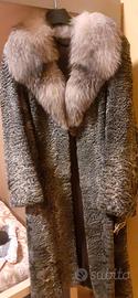 Pelliccia in agnellino persiano con collo in volpe, grigia ,cintura in vita. Taglia 42 44 Fatta su misura. Ottimo stato.