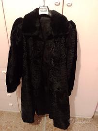 Pelliccia nera di Astrakan in ottime condizioni con collo in coniglio e tasche foderate.