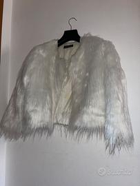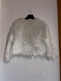 Pelliccia bianca sintetica crop quindi corta, taglia unica. Ha come dei brillantini come da foto. Pagata 60€ al negozio e usata una volta sola