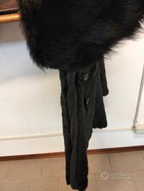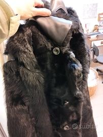pelliccia corta con bavero doppio petto, interni in pelle e bordo sul fianco in pelle. non è indicata alcuna marca o materiale. con tasche laterali senza cerniera