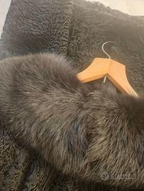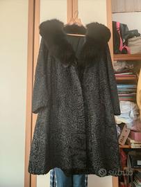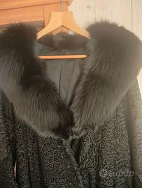 Pelliccia di astrakan nera originale con collo di pelliccia di visone nero originale