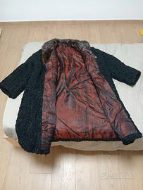 pelliccia di astrakan vero e collo di visone vero. Fodera interna in raso bordeaux con disegno di cristalli