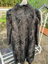 Pregiatissimo cappotto di Breitschwanz, pelliccia dal pelo piatto e lucente, morbidissimo, disegno a macchia d'olio. La sua particolarità è uno splendido colore nero inchiostro tendente al blu. Taglia 46