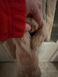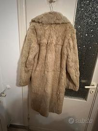 Cappotto lungo in pelliccia di coniglio color beige. Il capo è realizzato con pannelli verticali cuciti, che rendono il manto uniforme. Presenta un colletto ampio completamente rivestito in pelliccia e una chiusura frontale con zip centrale. Le maniche sono lunghe e dritte, con la stessa densità e lunghezza del pelo presente sul corpo del cappotto. L’interno è foderato in tessuto chiaro e include un’etichetta cucita sul retro del colletto. La lunghezza del capo arriva circa a metà polpaccio. Struttura complessiva dritta, senza sagomature. La marca è Colosseum e la taglia M.