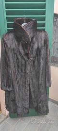 Splendida pelliccia di visone naturale, colore scuro intenso, lunghezza media, con collo ampio e linea raffinata.