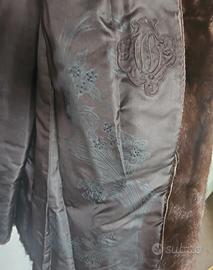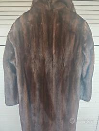 Pelliccia di visone toscano, marrone scuro, doppio petto con collo e cuciture regolari, ricami di stoffa interni e bottoni. Taglia M