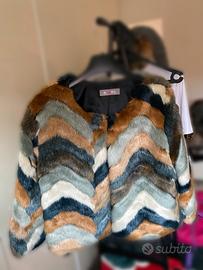 Giacca eco-pelliccia multicolor con motivo zig-zag, originale e d’impatto. Perfetta per chi ama distinguersi con un capo unico e vintage.