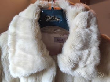 Pelliccia ecologica corta per donna, lunghezza fino al girovita, colore bianco/panna, elegante, con il colletto e chiusura a gancetti davanti, taglia S/M.