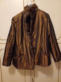 Pelliccia/giacca double face petit gris/tessuto lucido con fili di seta color bronzo, tg 44/46, lunga circa 60cm.