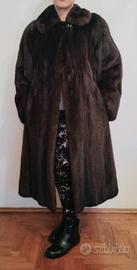 Pelliccia in visone scuro realizzata su misura dalla pellicceria pordenonese Dalla Libera. Lunghezza dal collo al bordo inferiore: 108 cm; misura mezzo busto dietro: 90 oil cm. Manica a raglan, tasche a filo, bottone sul collo, fodera personalizzata, lacci interni e finiture di pregio come la passamaneria tra fodera e pelliccia.