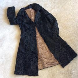 Pelliccia in agnello nero creazione dell’eccellente artigianato italiano. A tasche tagliate sul davanti, allacciatura con ganci a scomparsa, orlo a taglio vivo e una particolare fodera in raso rosa doppiata da tulle nero operato. Il collo può essere portato aperto modello trench oppure rialzato. Veste taglia 44
