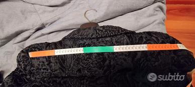 Materiale: pelliccia con superficie riccia e lucida, molto compatta, tipica dello stile astrakan. Colore: nero profondo, con riflessi leggermente più chiari a seconda della luce. Taglio: il cappotto ha una linea morbida e leggermente svasata sul fondo. Colletto: colletto arrotondato, ampio e morbido, sempre in pelliccia. Chiusura: un bottone decorativo grande e scuro visibile sotto il colletto; il resto delle chiusure non è completamente visibile ma sembra una chiusura frontale centrale. Maniche: lunghe, con polsini risvoltati sempre dello stesso materiale. Interno: foderato con un tessuto fantasia a motivi paisley nei toni del marrone, verde e ruggine. ritiro solo di persona