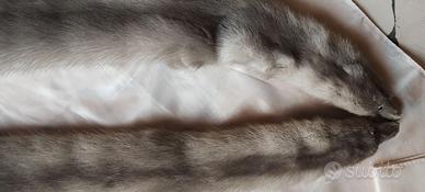 Sciarpa fatta con 2 visoni zaffiro, roveniente dal Nord Europa. Grazie alla sua delicata sfumatura di grigio naturale è difficilmente riproducibile con tinte artificiali. Si possono usare anche per avvolgere la testa. È tra i visoni naturali più rinomati e pregiati. Sono in perfette condizioni. Nuove e mai usate. Cm 67 cadauno; compresa coda cm 85. Vendita a Milano città in contanti dopo visione dell’acquirente