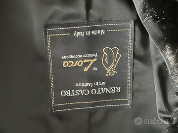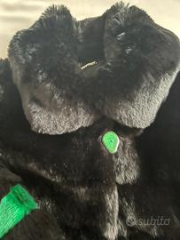 Cappotto donna in pelliccia sintetica Renato Castro by Lorca, nuova, taglia 42, colore nero con fasce ad intarsio verde brillante, bottoni forma particolare stesso verde brillante