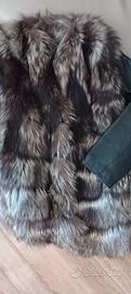 Gilet vera volpe argentata naturale, lavorazione orizzontale con inserti in vera pelle. Fodera stampa firmata Emilio Pucci.