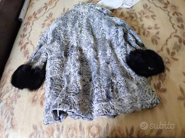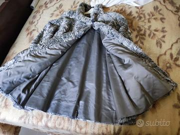 Cappotto in pelliccia vera di agnello persiano (astrakan) fino al ginocchio circa, con bottone grande e ganci interni per chiuderlo lungo tutta la lunghezza, con finiture in pelliccia nera sui polsini.