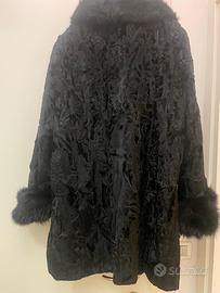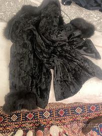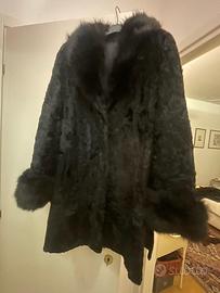 Giacca vintage in Breitschwanz con collo e polsi in volpe nera. Capo di taglio moderno con due spacchi ai lati, 3 ganci a scatto, tasche e fodera in raso. Modello attuale, giovane, portabile sempre. Veste fino alla taglia 46. Misure: spalle 45, ascelle 57, Lunga 86