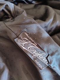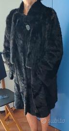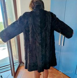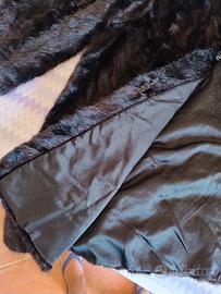 Visone marrone scuro naturale, lavorazione artigianale effetto "spina di pesce", collo alla coreana con chiusura a fiocco/nodo, bottone e ganci interni. Manica a giro leggermente svasata, spalle senza imbottitura, tasche verticali a scomparsa, fodera nera a piccoli pois. Lunghezza a ginocchio(90 cm). Tg 44/46