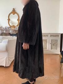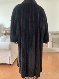 Pelliccia Visone nero a pelli intere con due tasche e chiusura con due bottoni. Lunghezza 110 cm. Lunghezza manica 52 cm. Larghezza Spalle 46/48 cm. Il giro pelliccia bordo inferiore misura 220cm.