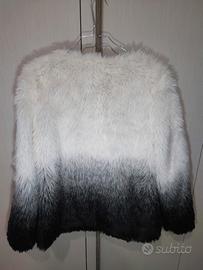 Vendo morbido pellicciotto, con sfumatura dal bianco al nero. Modello con chiusura frontale a cerniera, inserita su fascia centrale in finta pelle.